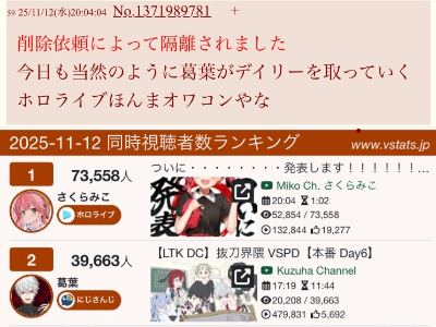 | … | 50225/11/14(金)09:53:44No.1372430449+>Vtuberって大変なんだな… |