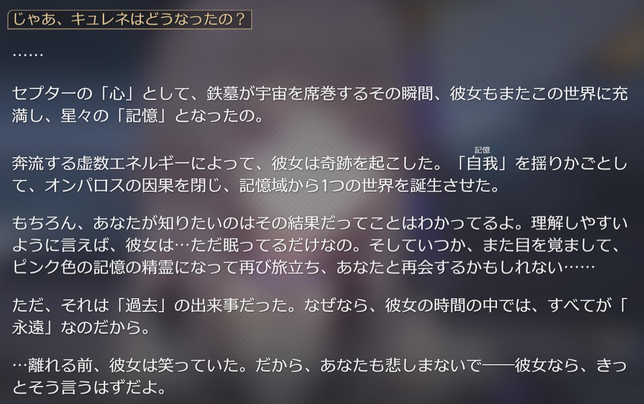 | … | 6025/11/14(金)18:18:55No.1372543334そうだねx7エピローグでオンパロスもキュレネもいつか復活するはずだよって伝えに来た時の悲しそうな顔いいよね |