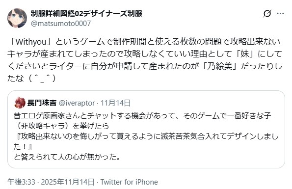 | … | 2725/11/16(日)23:22:06No.1373352483+非攻略キャラは一からキャラデザ任されるので手癖で属性詰め込んだ結果本人のお気に入りになるってのはよく聞く |