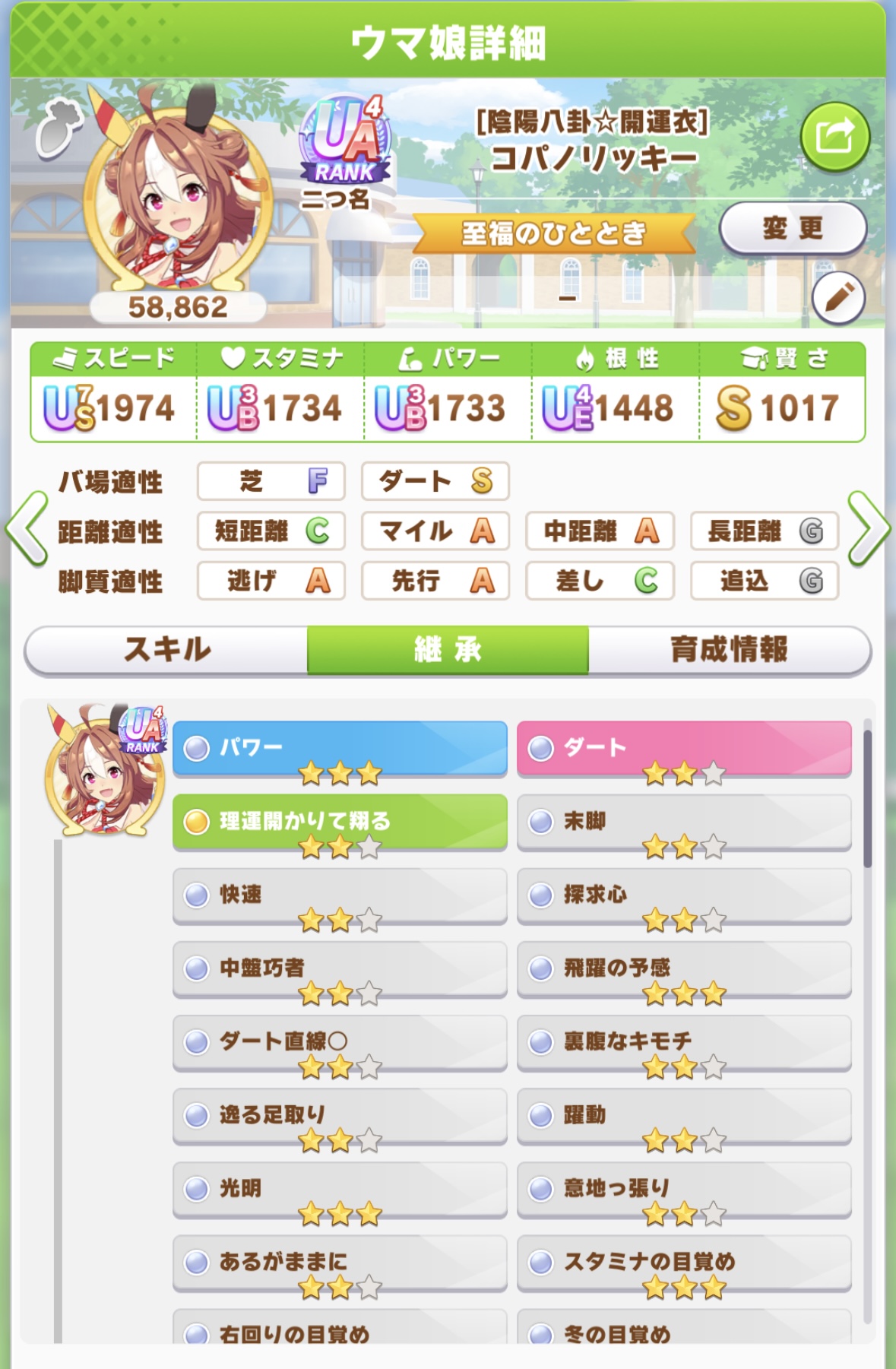 | … | 7625/11/17(月)20:12:17No.1373573151+スピ因子18目指してたけどもうスピ15パワ3で妥協していいのだ? |
