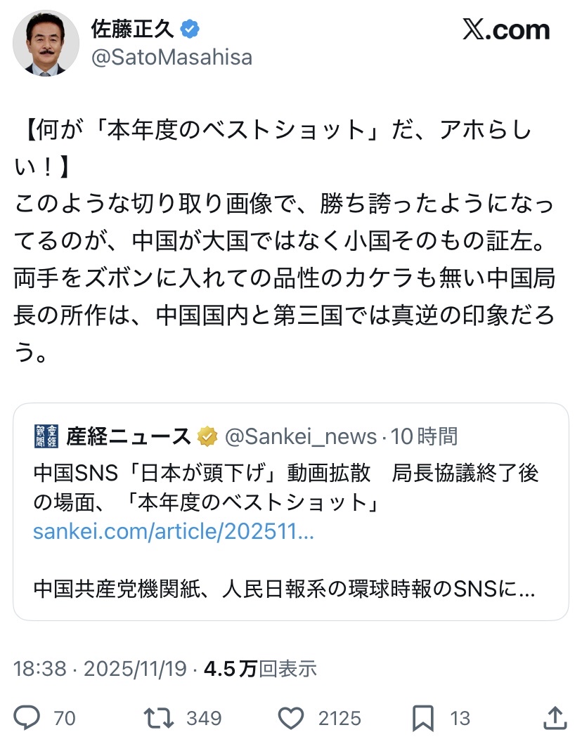| … | 5025/11/21(金)19:58:46No.1374794509そうだねx6>もしかしてあの外交官が一番中国にダメージ与えてるのでは… |