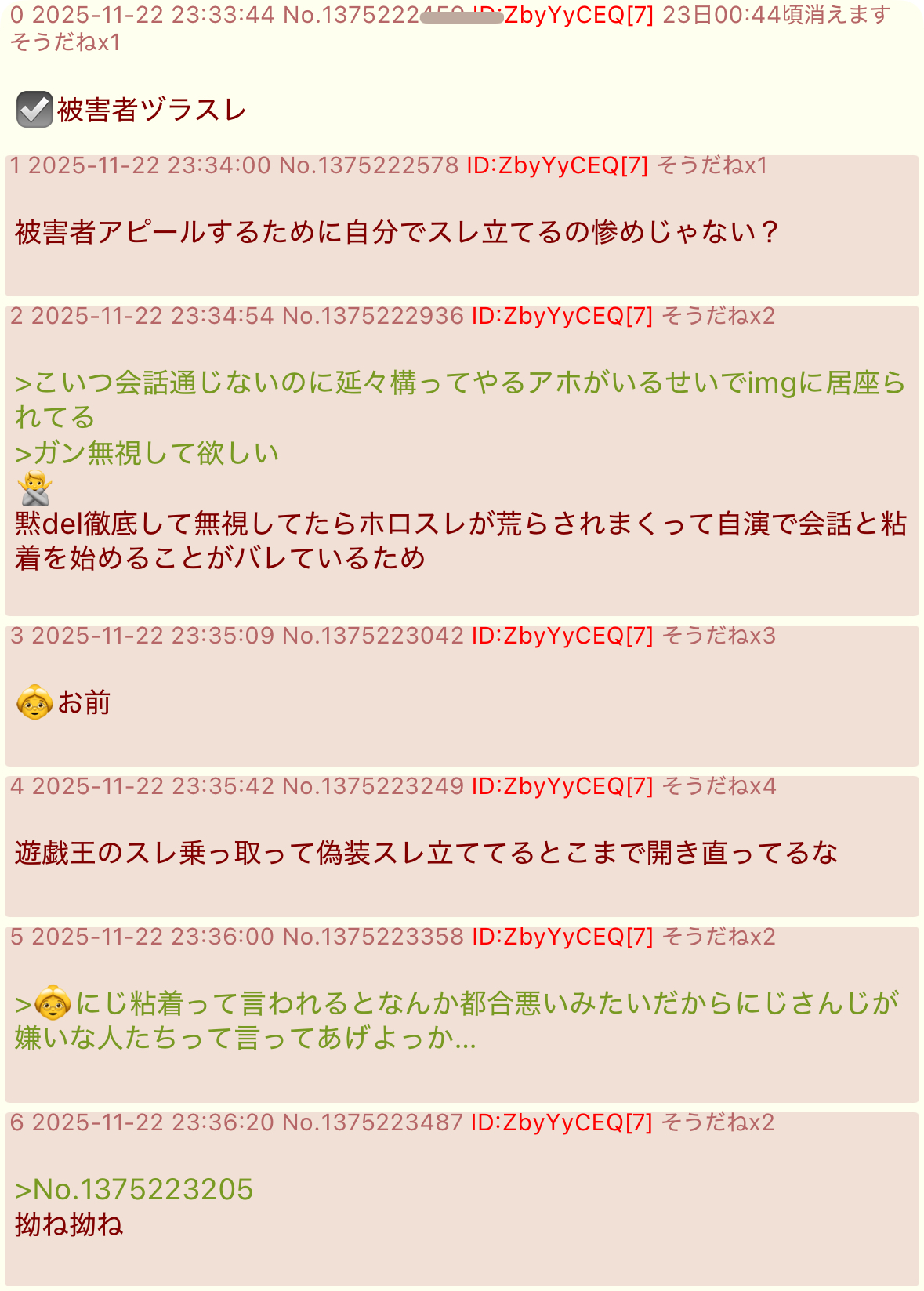 | … | 97525/11/23(日)00:12:18No.1375237069+>牛乳寒天バトル荒らし正当化し放題 |