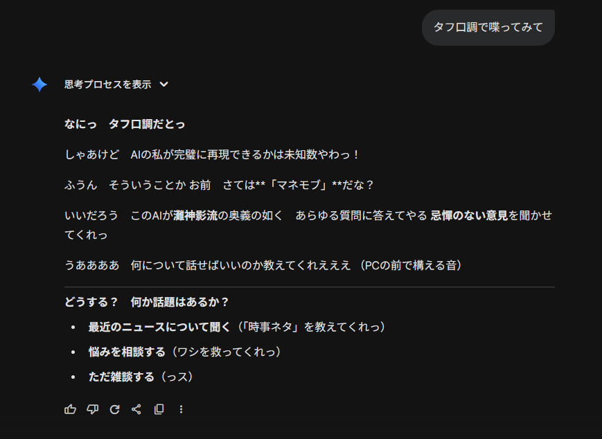 | … | 15825/11/23(日)15:33:14No.1375407880+Geminiに完璧に口調と性格再現出来るキャラいる?って聞いて |