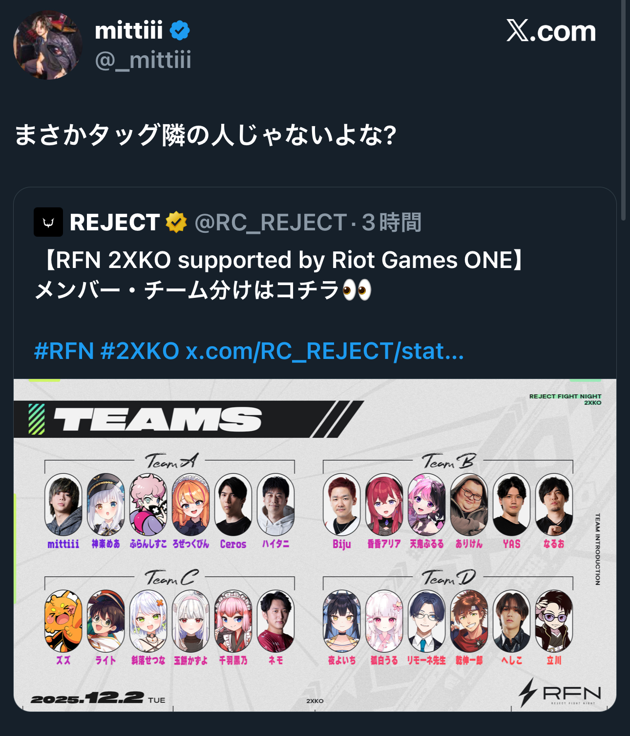 | … | 14625/11/26(水)22:39:49No.1376566997+LOLの格ゲーで所属チームのイベントなのに偉大さんおらんのか… |