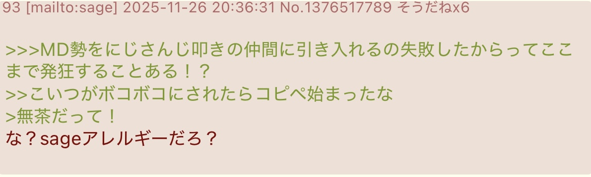 | … | 425/11/28(金)23:20:16No.1377208994そうだねx14こいつ別にメ欄の中身がsageじゃないやつにもsageって言ってるらしいな |