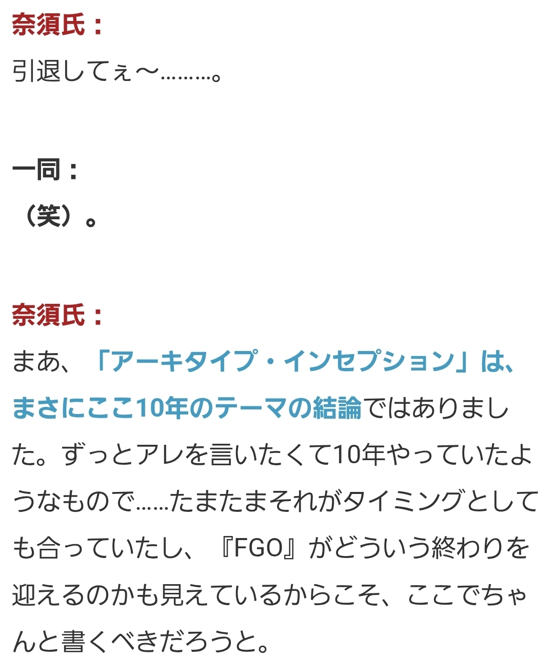 | … | 31925/11/29(土)01:40:57No.1377249382+>>「まずは「FGO」の第二部,それから“月の裏側”を完走するのが先決です。その後はTYPE-MOON第二期の集大成のようなものを出せたらいいなと思っています。」 |