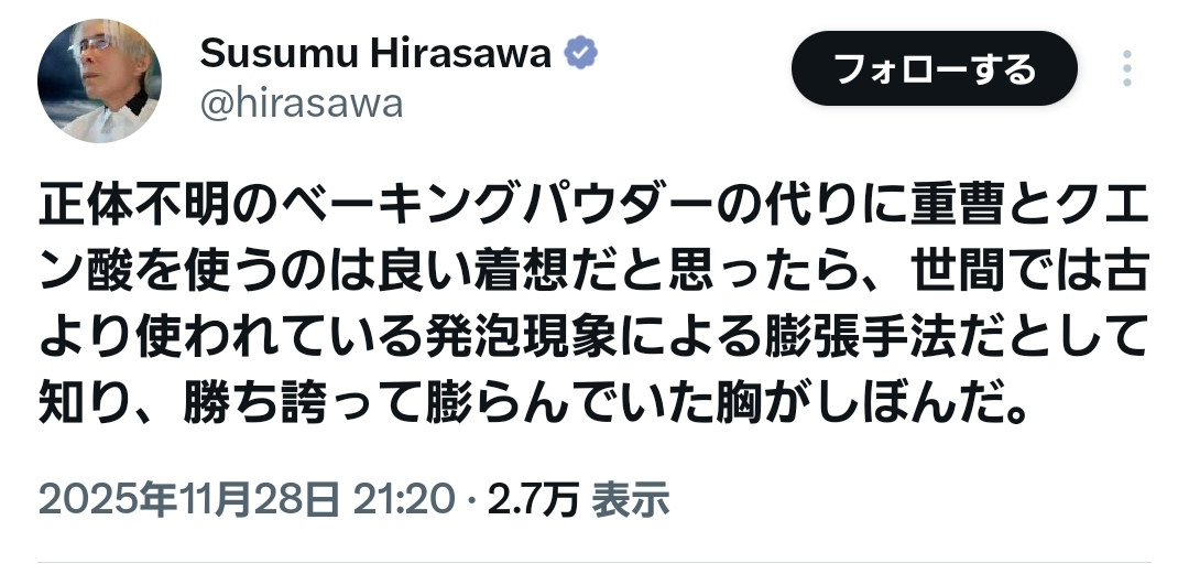 | … | 425/11/29(土)16:04:06No.1377394674そうだねx8>ベーキングパウダーってほぼ重曹では? |