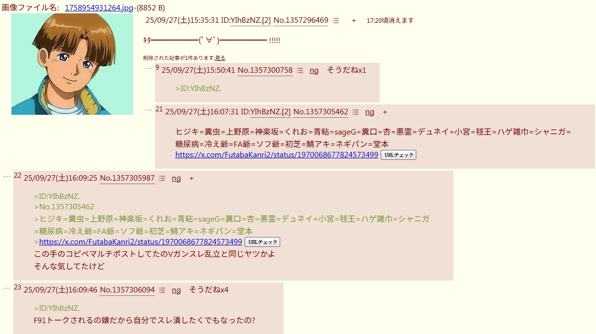 | … | 2625/11/30(日)15:48:37 ID:1dg23TssNo.1377767645+やってること自体は荒らしへのカウンターだから正義側といえば正義だな |