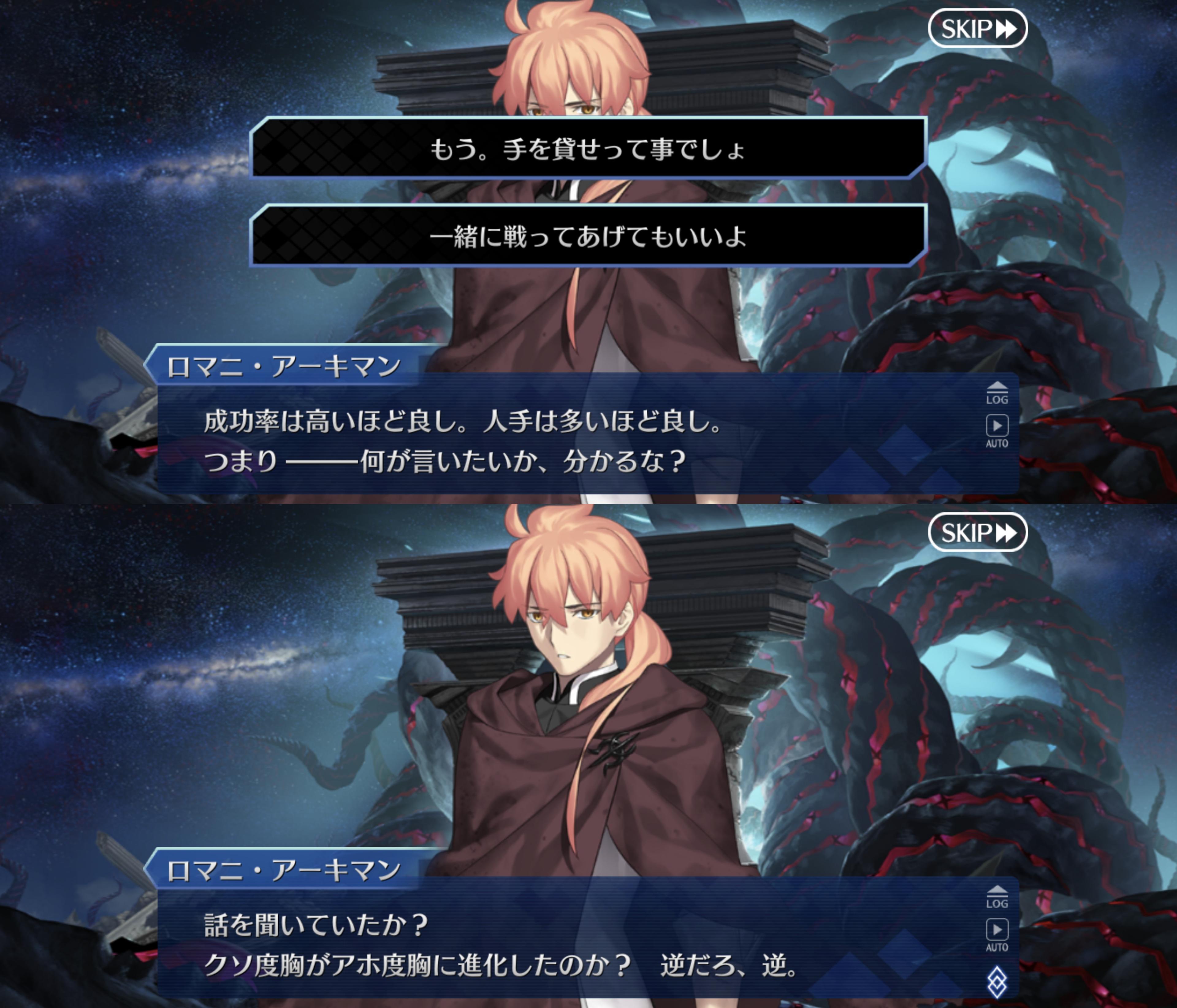 | … | 10025/12/01(月)20:50:12 ID:LUKfOy0MNo.1378243106+>そういえばゲーティアって「相手ごとに相手が好む人格に変えられる」みたいな設定あった気がするけど >今の妙にノリのいい性格は対ぐだ用ってことなのかな… >マシュ相手だとやや紳士だし 好む人格というか鏡みたいに映してるって感じだったはず |