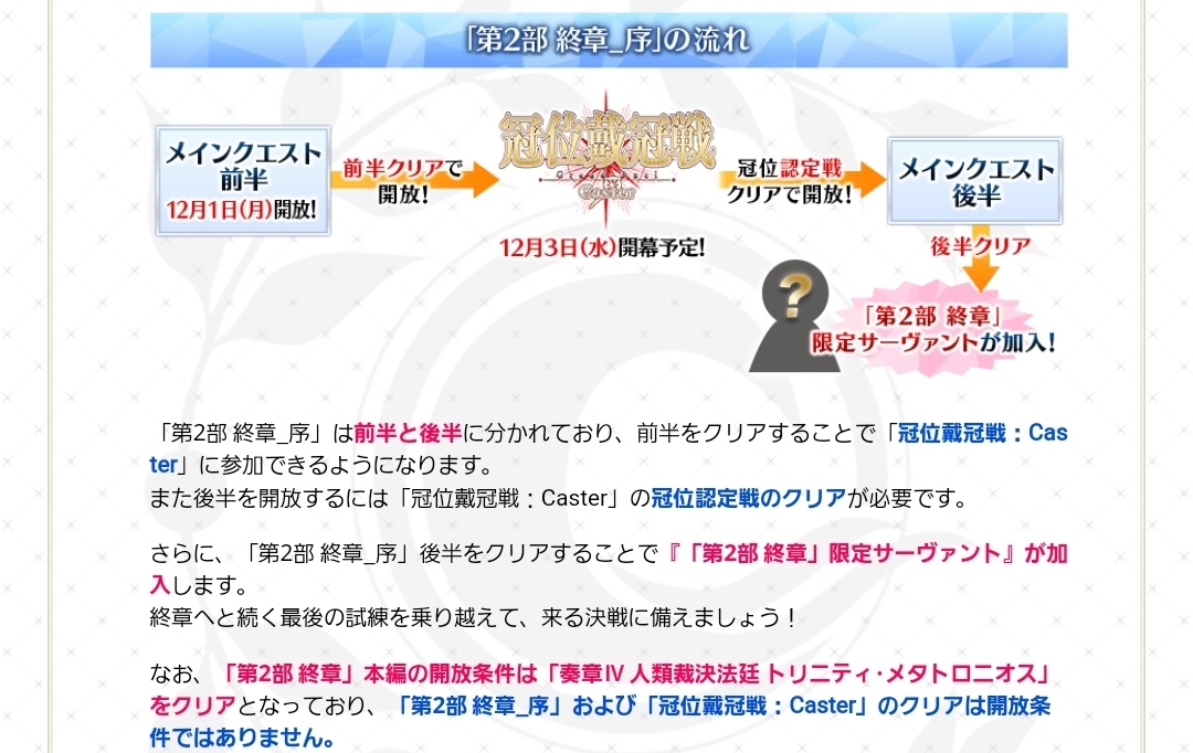 | … | 5925/12/01(月)20:48:32 ID:bL5r58/cNo.1378242397+・マイルームのマテリアル(ストーリー)において、「終章_序」の内容が「奏章」内に表示される不具合を確認しております。(12/1 20:00追記) |