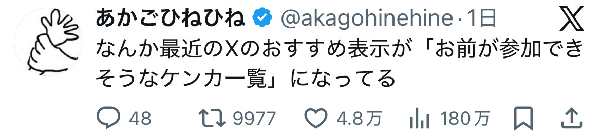 | … | 3325/12/01(月)22:27:50No.1378284281+自分のおすすめ欄は格ゲープロの生態と料理研究家を信じる人のツイートばかり流れてくるからまだ助かってる |
