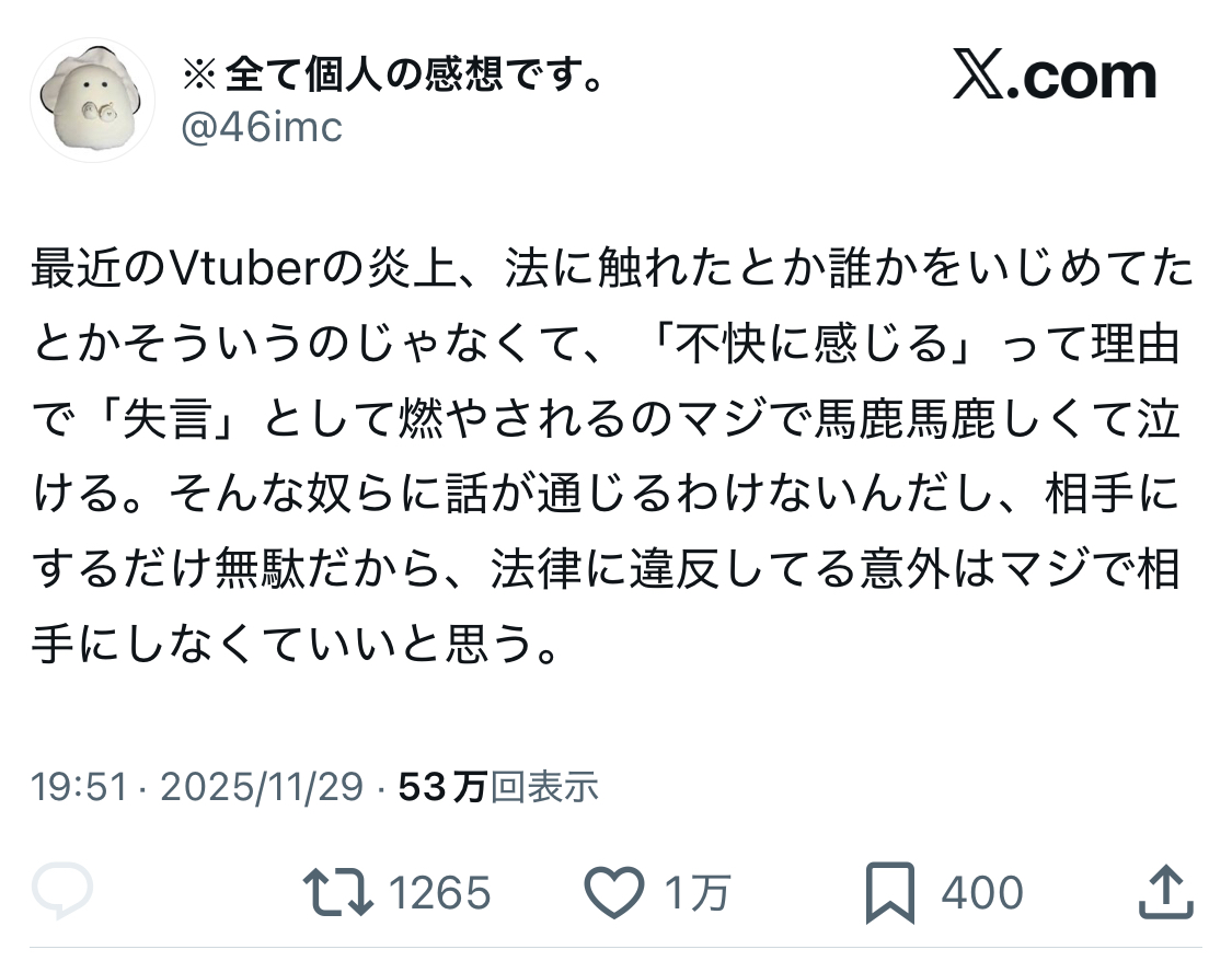 | … | 4225/12/01(月)23:11:50No.1378303810そうだねx16一般人からしたらVなんてよく知らんキモいものくらいの認識だから |