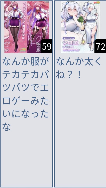| … | 725/12/03(水)21:54:22No.1378931819そうだねx3>なんか服がテカテカパツパツでエロゲーみたいになったな |