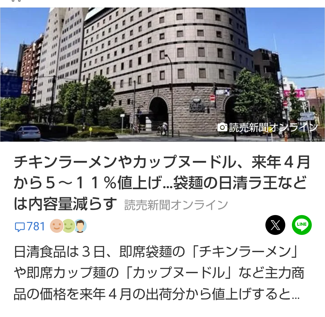 | … | 4025/12/04(木)01:00:12No.1378988895そうだねx3>日清食品は値上げしてもなお利益率全然よくなってない…っつーか食品会社は値上げをした上で決算だいたいボロボロなんでインフレがマジでキツいと思われる |