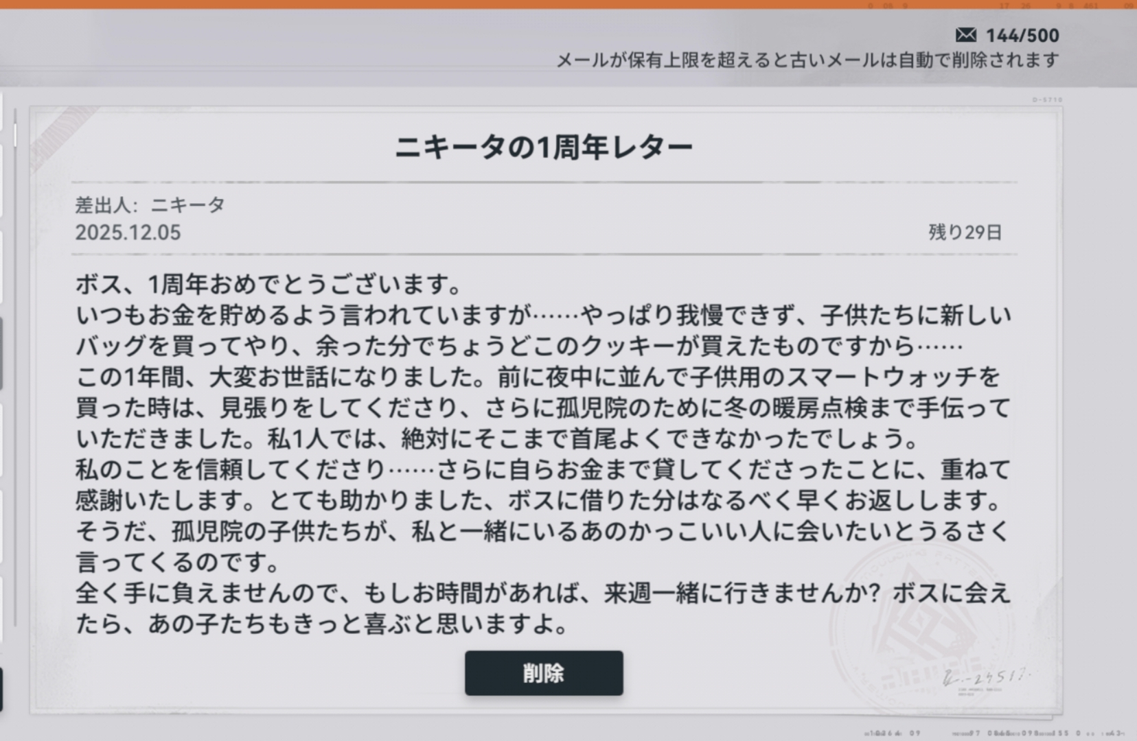 | … | 3425/12/05(金)10:56:23No.1379368732+1周年レターの送り主ってやっぱ指揮官ごとに違うんだ? |