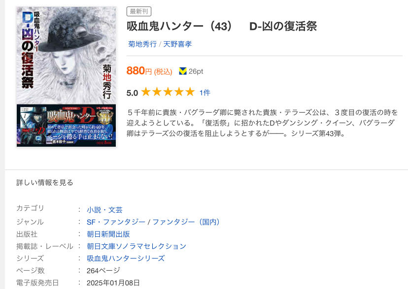 | … | 9225/12/05(金)11:11:44No.1379371438+>今でも本屋行けば吸血鬼ハンターD買えるかな? |