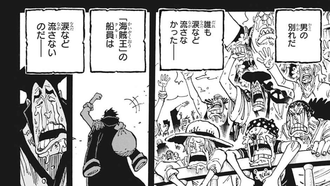 | … | 38125/12/06(土)00:36:47No.1379609672+>海賊王のクルーは >涙など流さないのだー >fu5993536.jpg 背を向けてるレイリーも涙してんだろうなって |