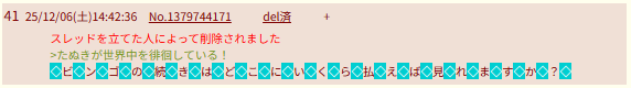 | … | 4125/12/06(土)14:42:36 ID:5W6TWzN.No.1379744171+スレッドを立てた人によって削除されました |