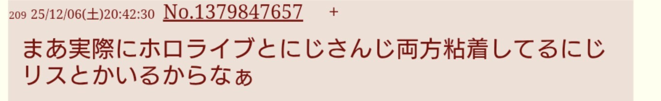 | … | 22225/12/06(土)20:44:14No.1379848245+>まあ実際にホロライブとにじさんじ両方粘着してるにじリスとかいるからなぁ |