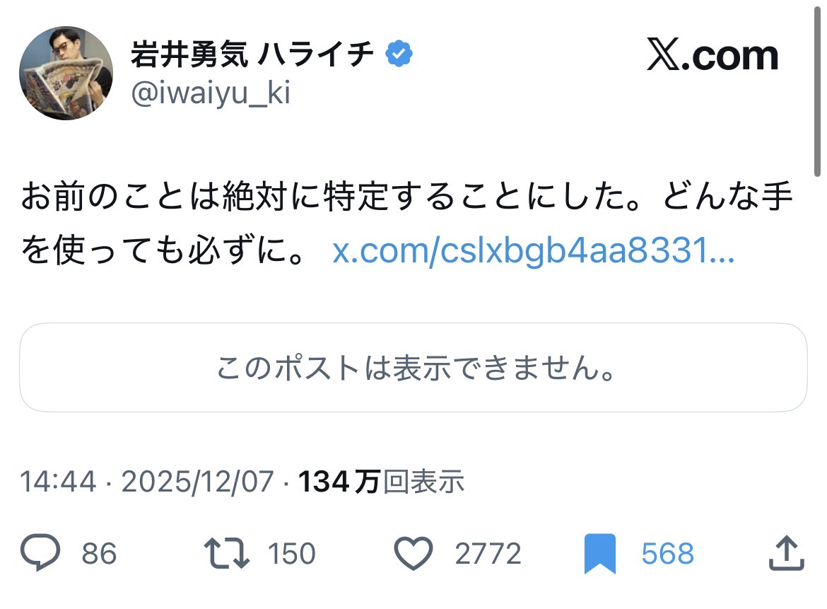 | … | 3025/12/07(日)17:41:51No.1380135593そうだねx14>どんな手を使ってもと言ってるし開示請求以外の方法も考えてるだろ |
