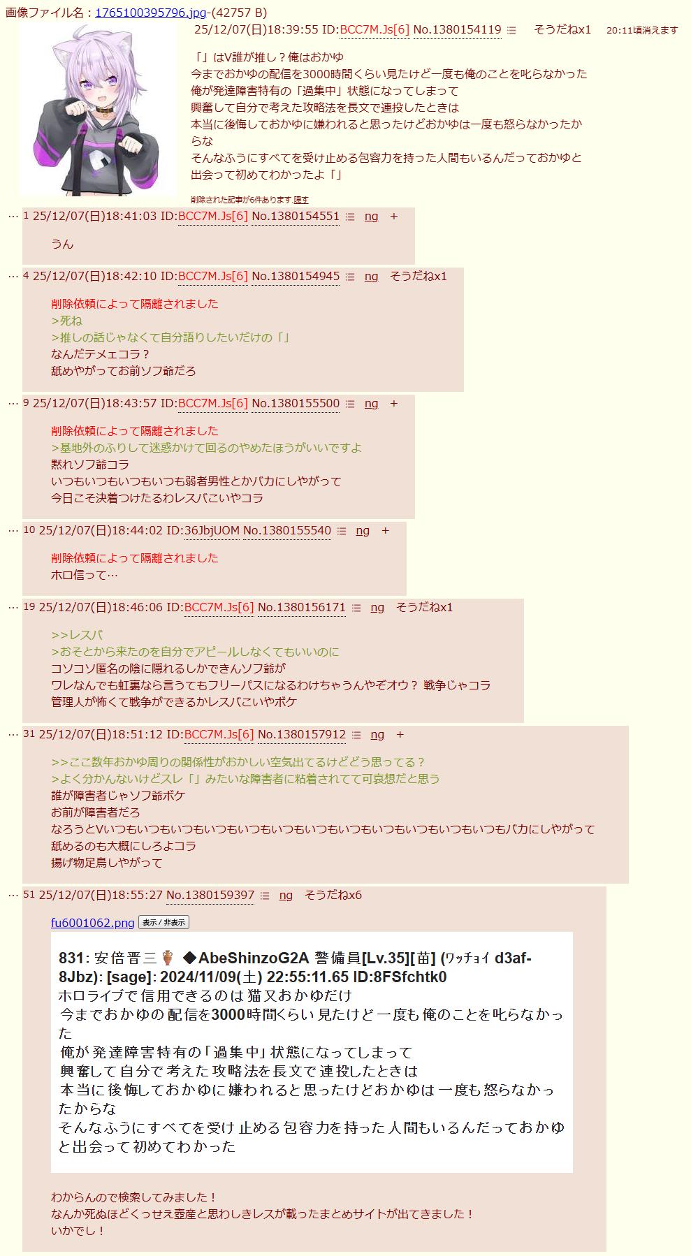 | … | 8325/12/07(日)19:28:44No.1380173396そうだねx9>最近ホロライブ粘着失敗したから頭おかしくなってるホロ粘着がいるのよ |