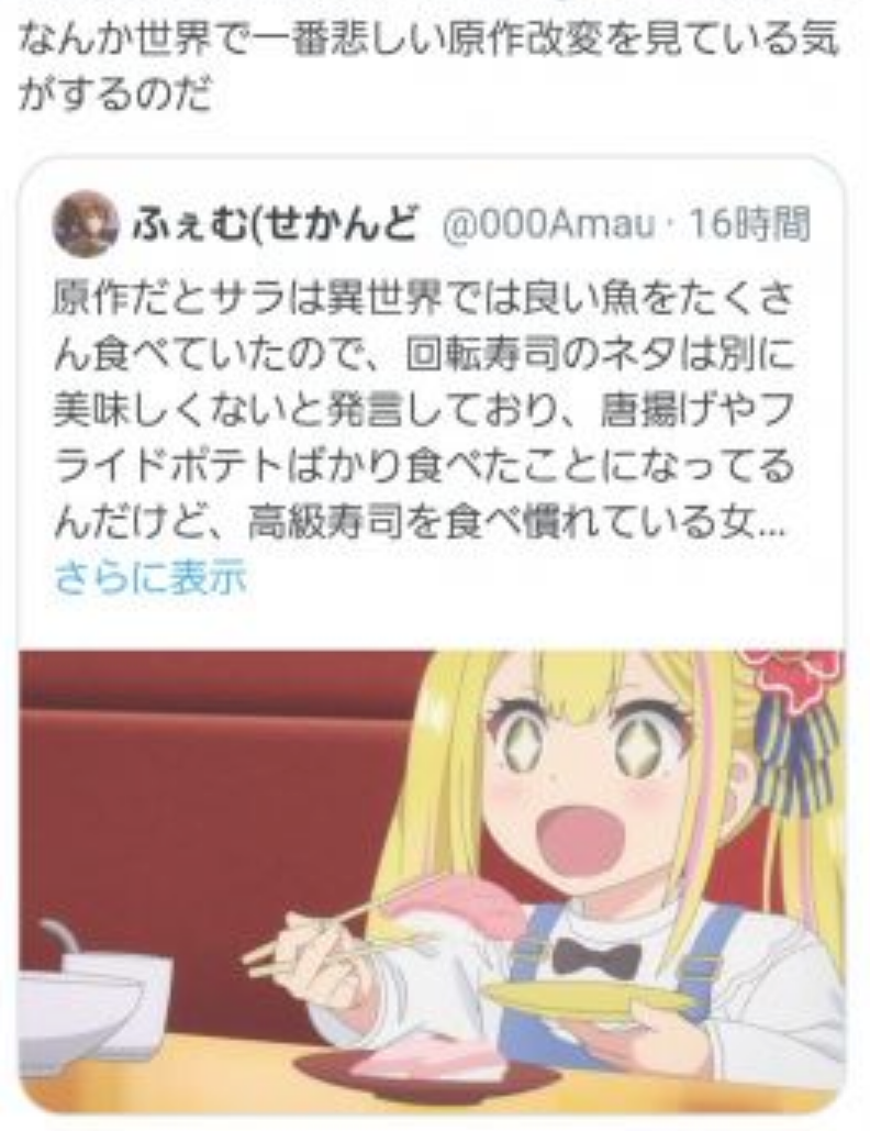 | … | 825/12/07(日)22:31:34No.1380256237+良く知らないんだけど視聴者が「回転寿司おいしくないと言う金持ちの描写が不快だ!」って怒って炎上すると懸念して原作改変したってこと? |