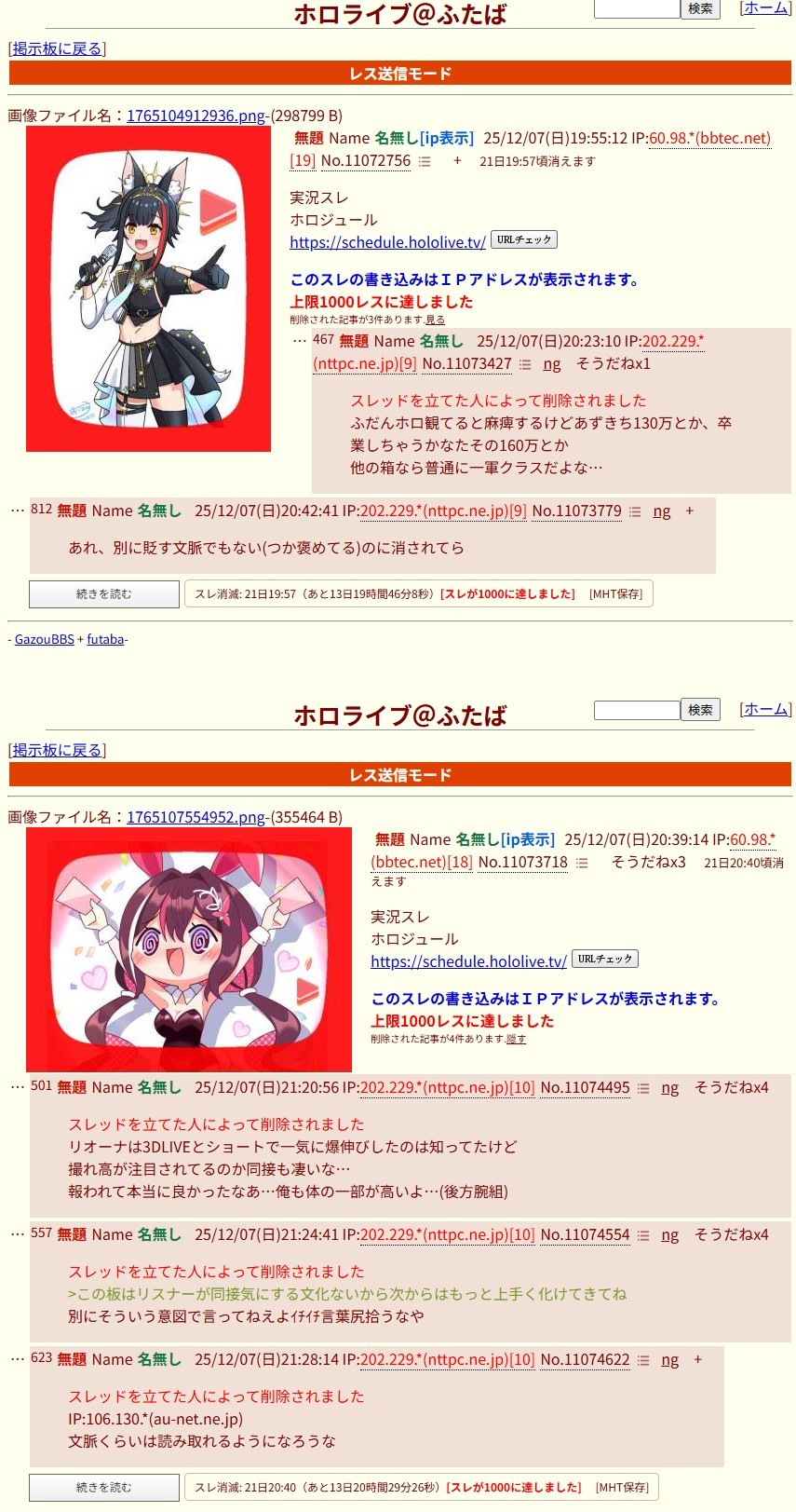 | … | 725/12/09(火)18:00:43No.1380771449+白上は配信中におしっこ離席しないんだっけ |