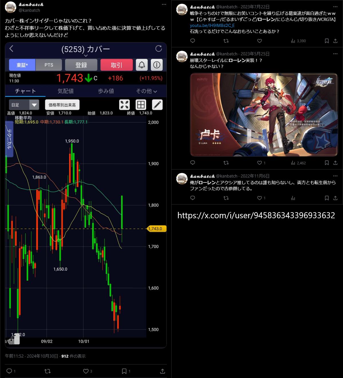 | … | 8225/12/09(火)20:33:58No.1380820488+>>>>弟に株買いだわとか色々頭をよぎったようだ |