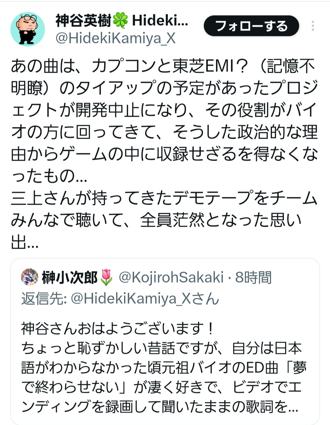 | … | 9025/12/09(火)20:59:38No.1380830567そうだねx2曲作った側だって別のゲーム用に作ってた曲だからバイオに合わないことなんて百も承知だろうし「バイオのEDとしては合わねぇわ…」って呆然とされてもでしょうねってなるだけだと思うよ |