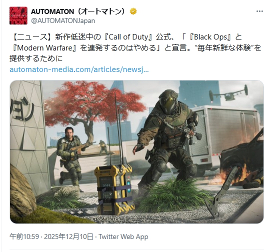| … | 1125/12/10(水)11:18:00No.1380974081+>>BO7が低迷してるのに関しては純粋にキャンペーンが最悪でマルチがイマイチなだけだと思うんですよね… |