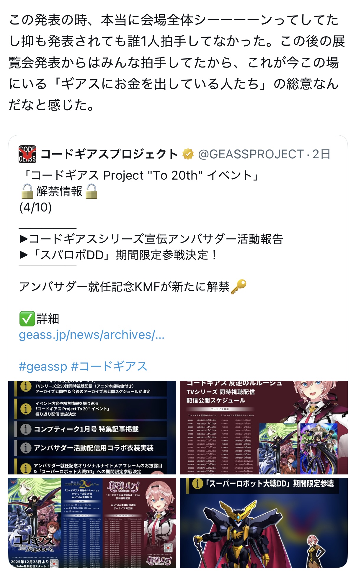 | … | 4725/12/10(水)12:16:49No.1380987862そうだねx6>>そもそもギアスってそろそろ20年が見えてくるコンテンツだし新規大歓迎だろ… |