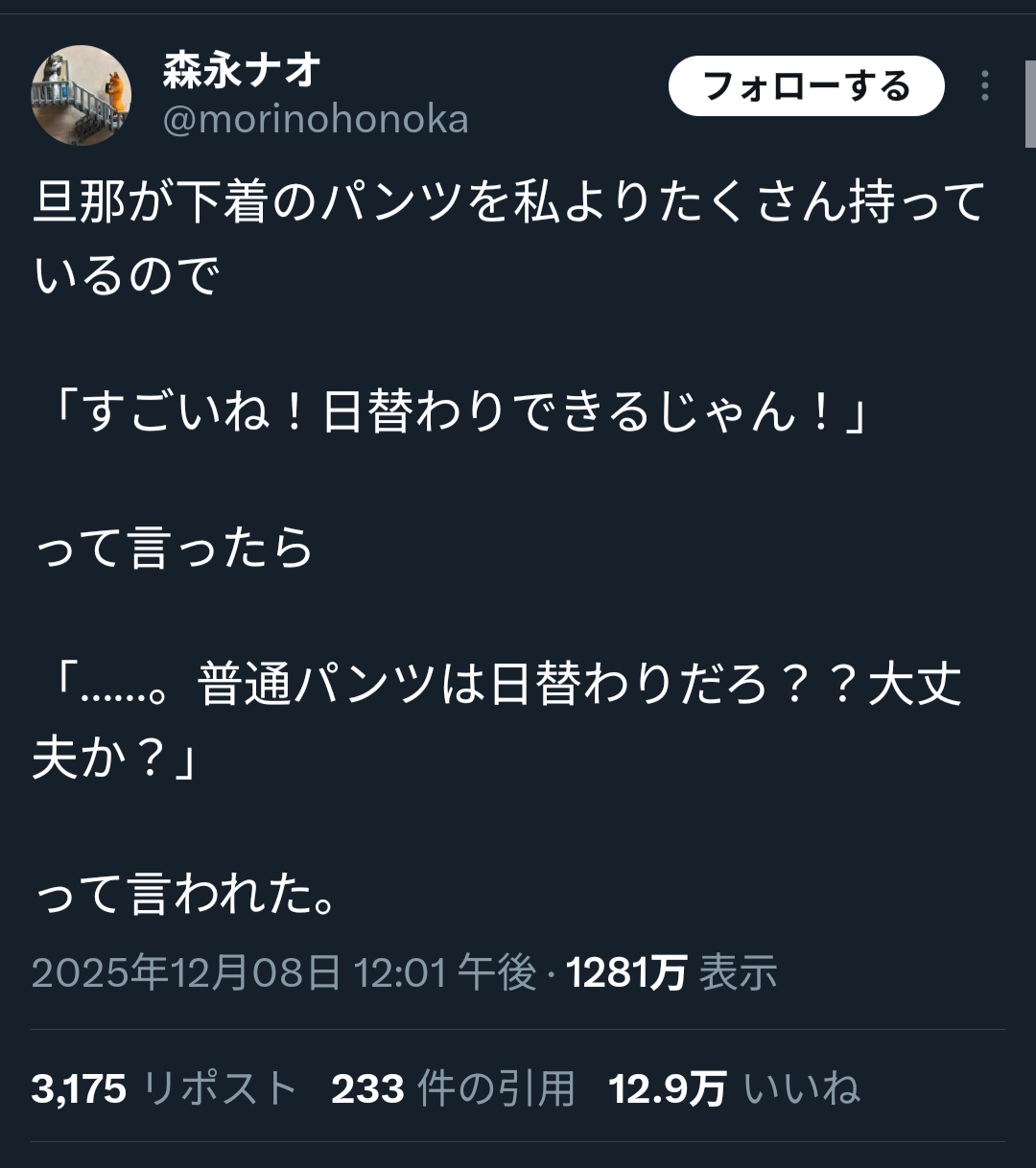 | … | 1725/12/10(水)21:55:37No.1381155934+>スレ画の女の人は同じ柄のパンツばっか持ってるけど旦那は色んな柄持っててすごい!って話だけどパンツずっと履いてる人みたいにも見えちゃう |