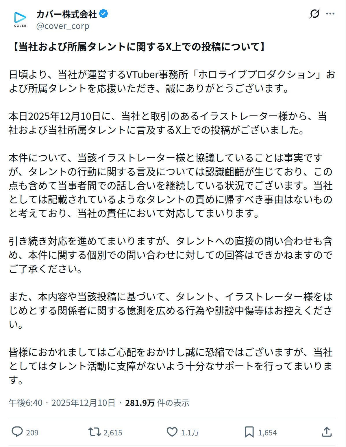 | … | 2425/12/10(水)22:30:05No.1381169385そうだねx1>>これに関してはタレントは護るしかといって対象絵師に私刑すんじゃねえぞって何一つ怖いこと言ってなくない? |