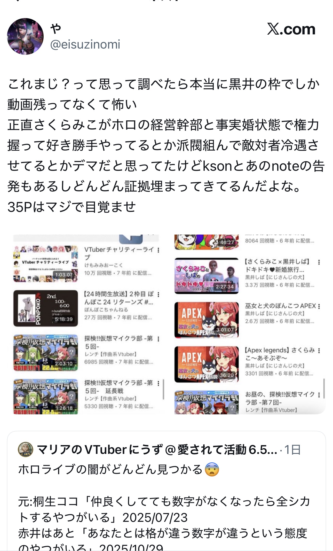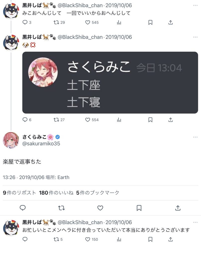 | … | 11325/12/11(木)14:16:06No.1381335153そうだねx6>>みこちが黒井しばとコラボしてた時期はそもそもほぼ全てのアーカイブが消えとるがな |
