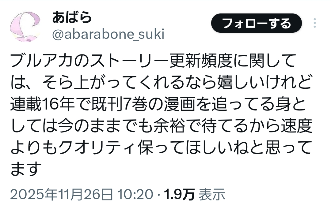 | … | 2925/12/11(木)13:46:16No.1381328325そうだねx4遅筆の漫画家で慣れてるからブルアカも無理せず良いもの作ってくれりゃいいよ |