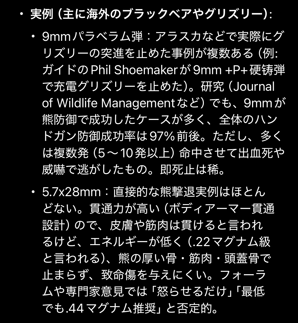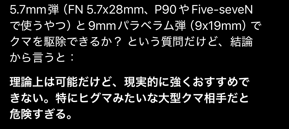 | … | 38725/12/11(木)19:19:44No.1381414391+>>海の向こうで実際に熊に対してぶっ放してる人らも5.7はやめとけみたいな感じだな |