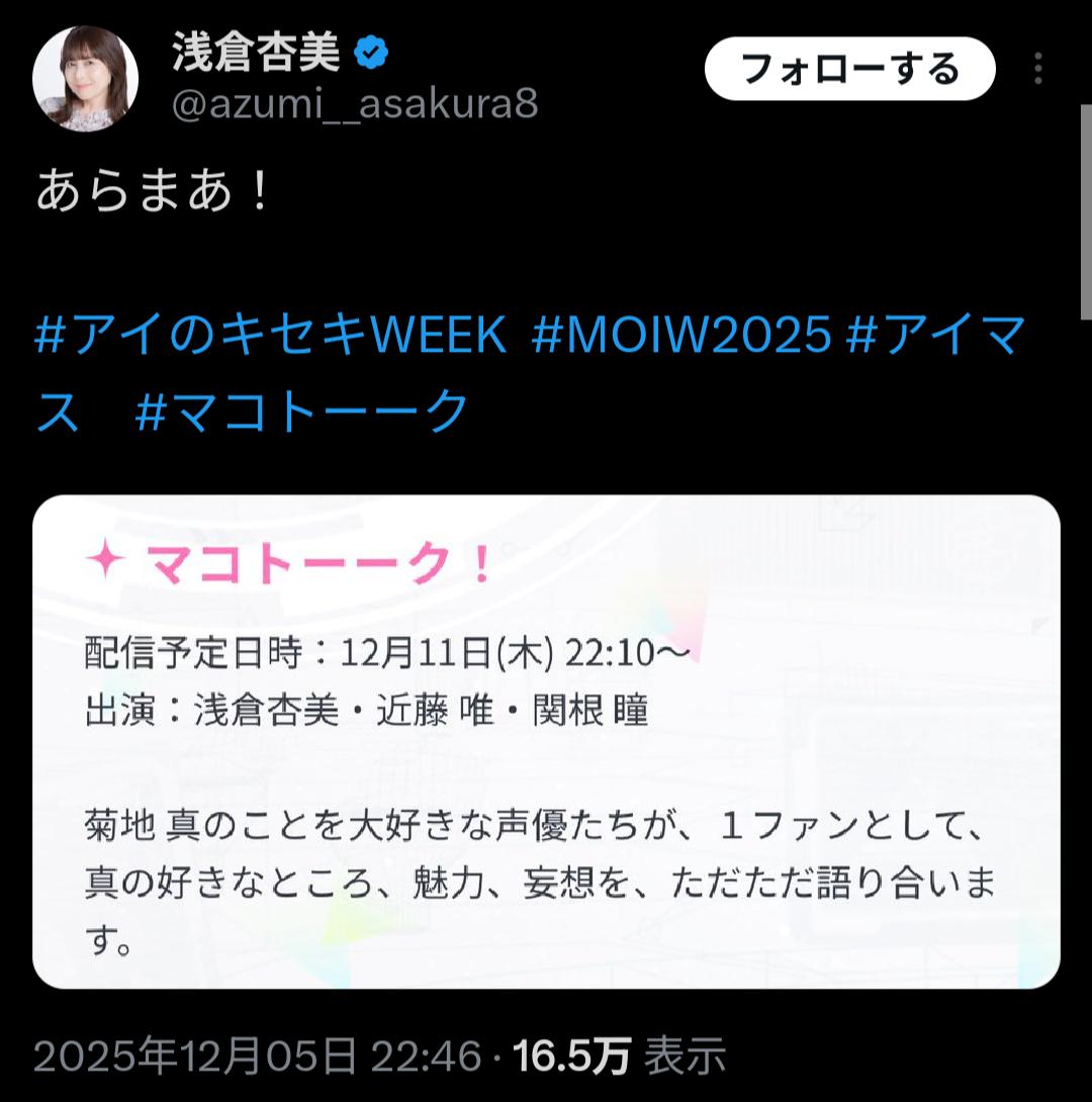 | … | 60825/12/11(木)21:53:41No.1381473601+>生放送形式では歴代最長のアイマスラジオでニコニコ全体を見てもトップクラスの有料会員数なので本当にすごいラジオなんですよ |