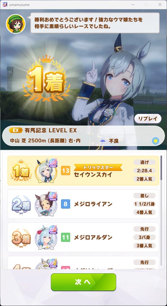 | … | 10525/12/11(木)23:42:10 ID:F9S75l92No.1381514312+雨降らせたらUB7ブライアンちゃんで勝てました |