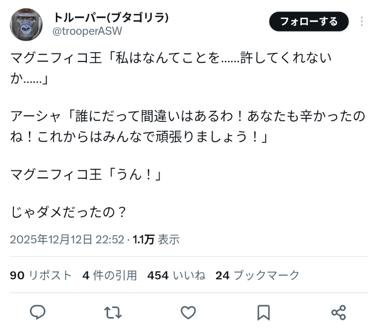 | … | 225/12/13(土)01:03:23No.1381872170そうだねx7もう王を許してやってくれ |