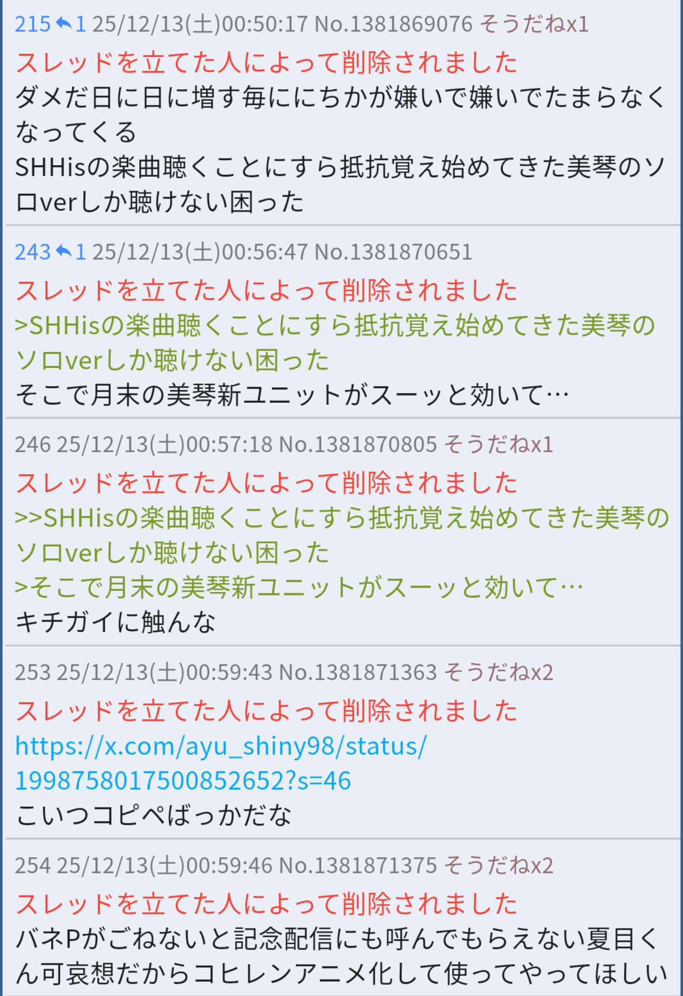 | … | 1125/12/13(土)01:32:10No.1381878415そうだねx1>貼られるスクショも9割がXからの転載っつーか… |