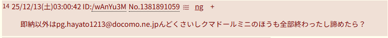 | … | 89025/12/13(土)08:09:46No.1381911378そうだねx2漏らすのはメアドだけにしとけよハヤトってなガハハ |