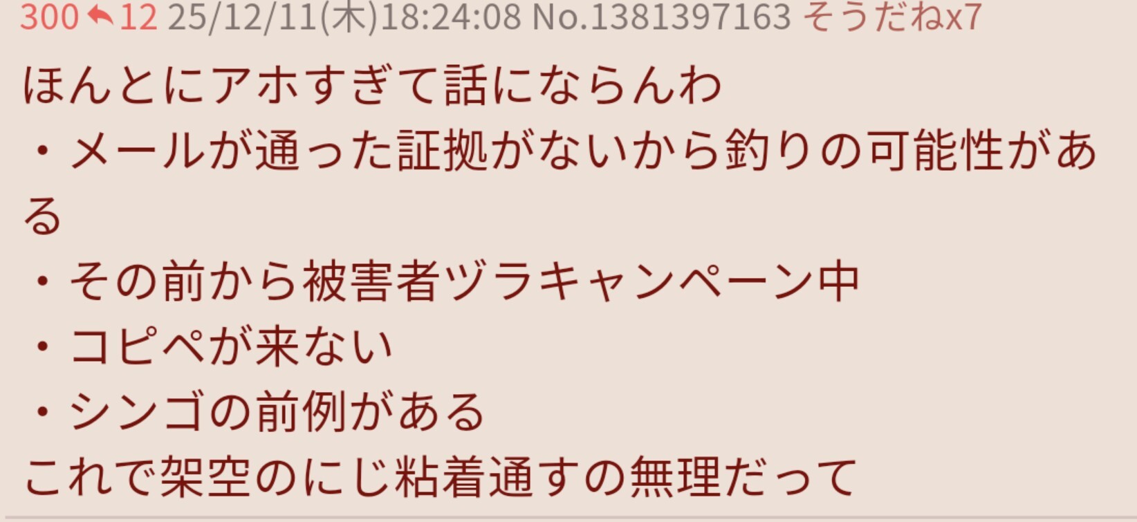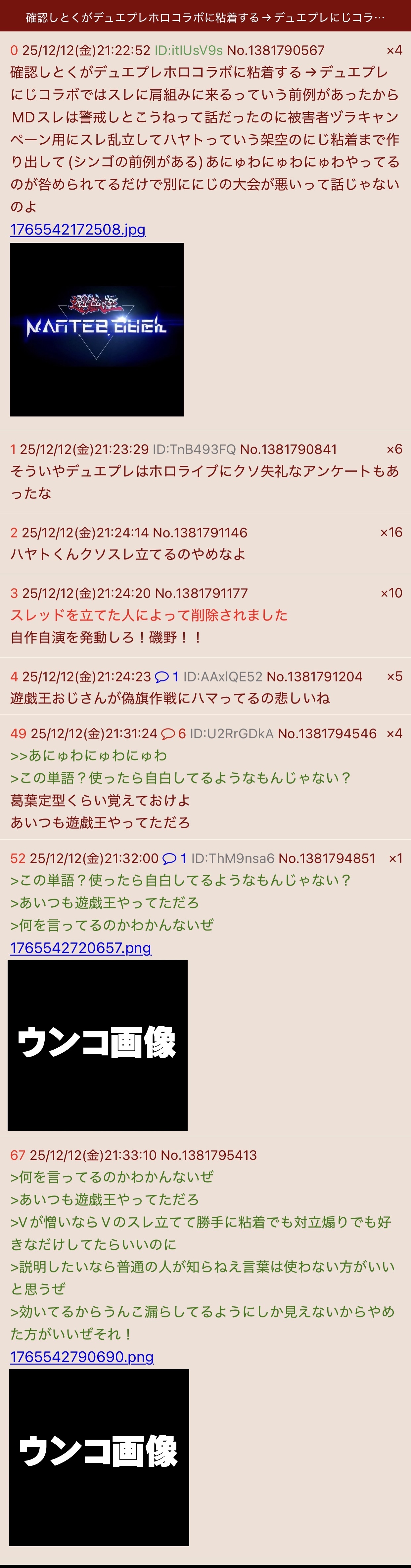 | … | 55025/12/13(土)11:12:10No.1381948924そうだねx2何がお笑いってここ数日のにじ粘着スレの乱立加速発狂(らっきょう)中に |
