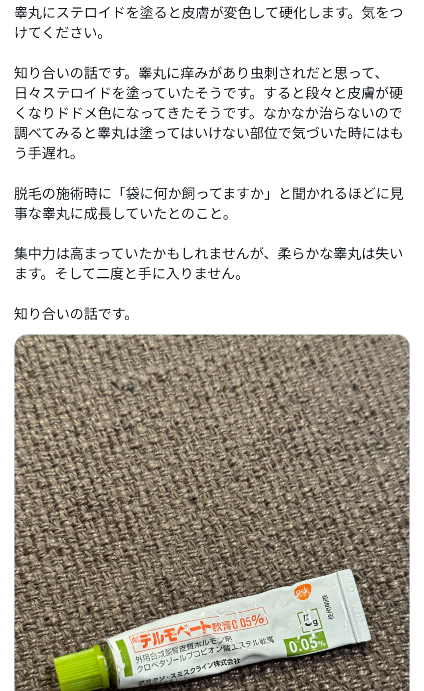 | … | 9525/12/13(土)15:05:06No.1382018284+>医者や薬剤師のアドバイスなくステロイドを使うな |