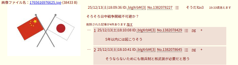 | … | 4025/12/13(土)18:20:48No.1382082514そうだねx3>>仮に開戦しても勝てるのか? |