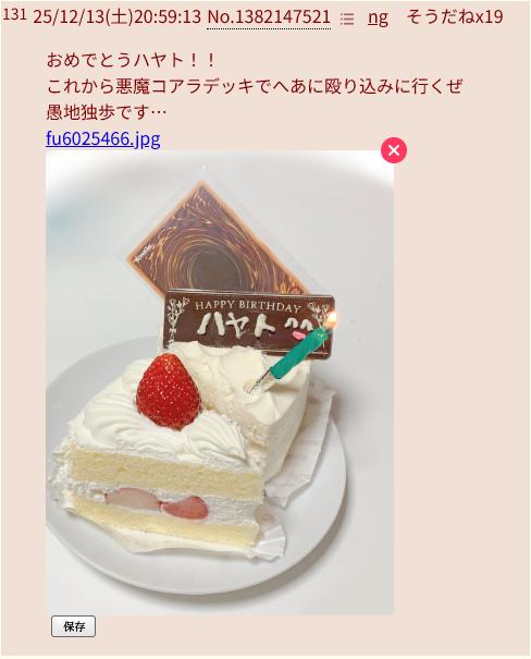 | … | 9225/12/13(土)20:48:32 ID:73GfaVCgNo.1382143053そうだねx2ハッピーバースデイハヤト! |