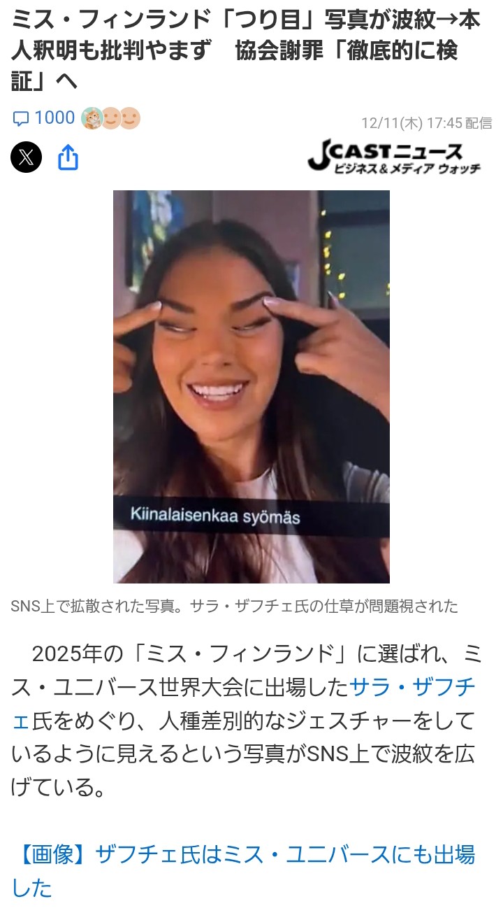 | … | 1225/12/14(日)08:58:54No.1382287743そうだねx6ミス・フィンランド2025のサラ・ザドチェ氏、「中華料理を食べてる」のキャプションとともに吊り目ジェスチャーをした写真が流出して大炎上。 |