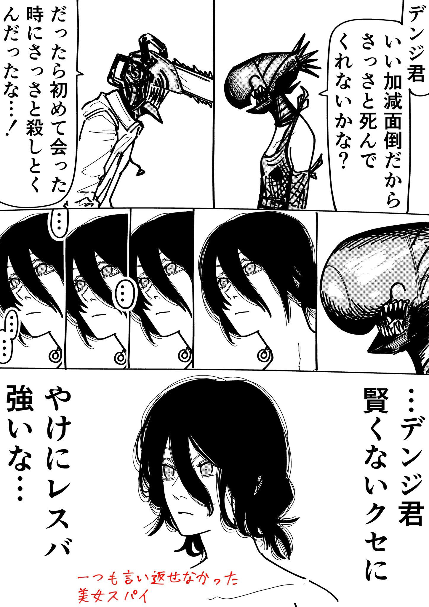 | … | 1425/12/14(日)13:52:07No.1382369854そうだねx5デンジって予想外の返答で相手の予想を覆すシーン多いからそういう意味でレスバ強いのは事実だと思うけど |