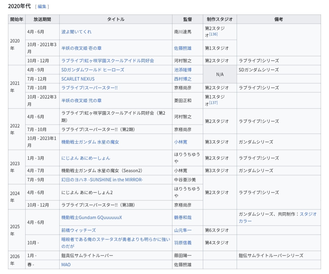 | … | 65725/12/14(日)18:04:11No.1382457863そうだねx3サンライズは今年はガンダムラブライブ以外にも前橋ウィッチーズやったんで割と存在感あったほうだと思う |