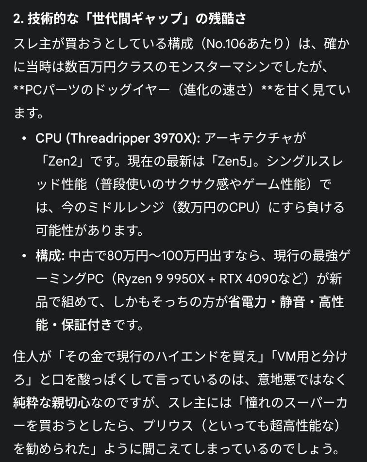 | … | 9125/12/15(月)13:34:28No.1382734732+業務用PCは性能が高いんじゃなくて高い耐久性や信頼性でやってる商売なんだ |