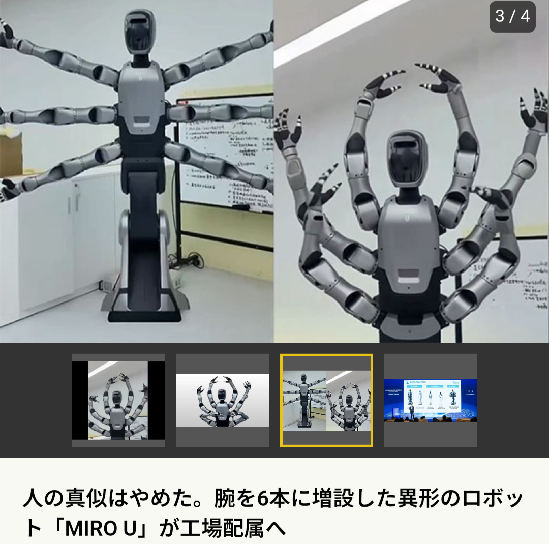 | … | 2425/12/15(月)15:58:26No.1382763634そうだねx2人型ロボットの先みたいな言い方してるけどこれ全部既存技術じゃん |